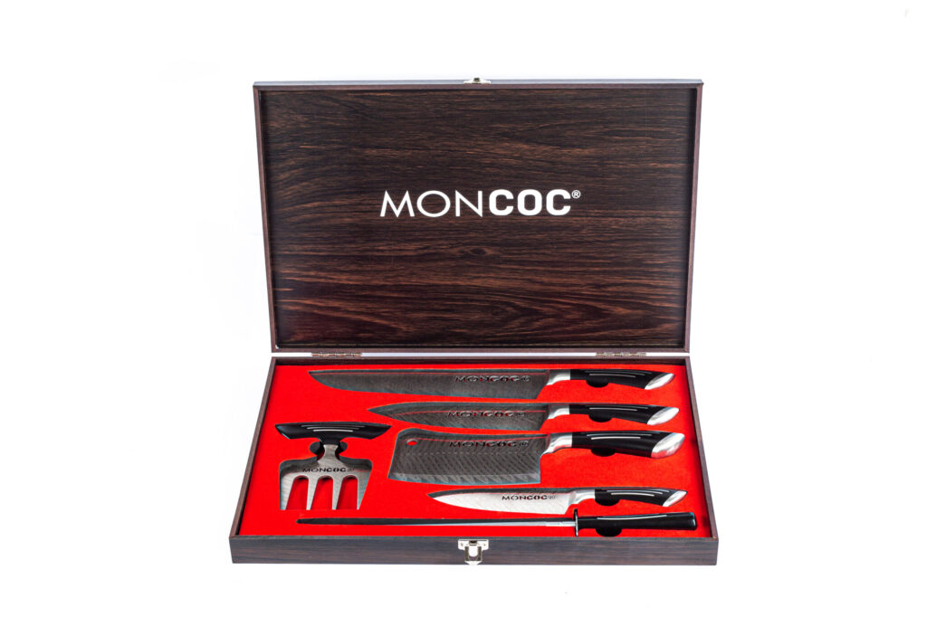 Os conjuntos exclusivo é composto por facas com lâminas em aço inoxidável de alta resistência, detalhadas com marcação a laser em estilo damasco, oferecendo um visual único e refinado.
