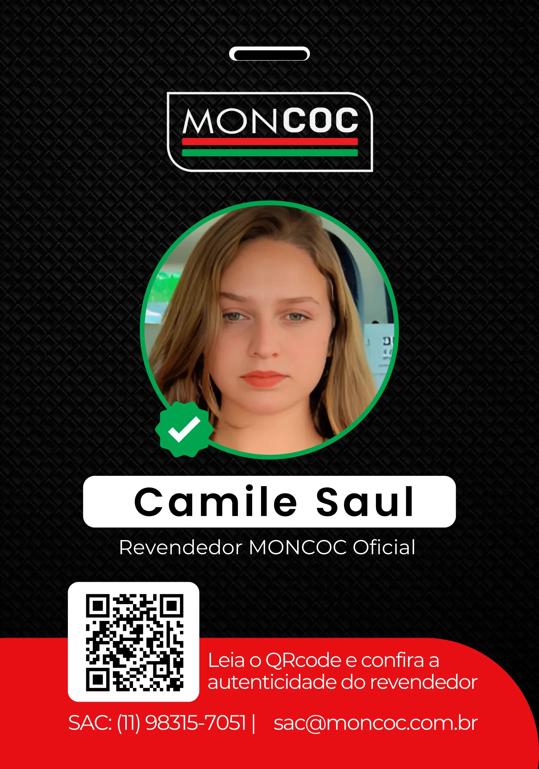 • Crachá MONCOC: Todo revendedor oficial possui um crachá personalizado com um código único.